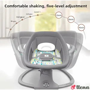 - 5 مستويات هزّ مريحة قابلة للتعديل: يمكن تعديل الكرسي بـ5 سرعات مختلفة (من المستوى الأول حتى الخامس)، لتناسب احتياجات وراحة الطفل في أوقات النوم أو الاسترخاء. يُمكن أيضًا ضبط مدة الهز حسب الوقت (15، 30، أو 45 دقيقة).