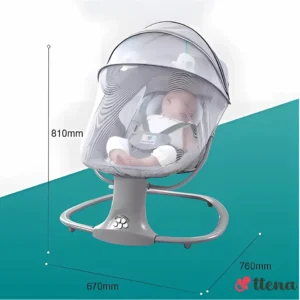 - جهاز تحكم عن بعد: يوفر راحة مثالية للأهل من خلال إمكانية التحكم الكامل في الكرسي عن بعد دون الحاجة للاقتراب كل مرة، سواء لتغيير مستوى الهز أو تشغيل الموسيقى.